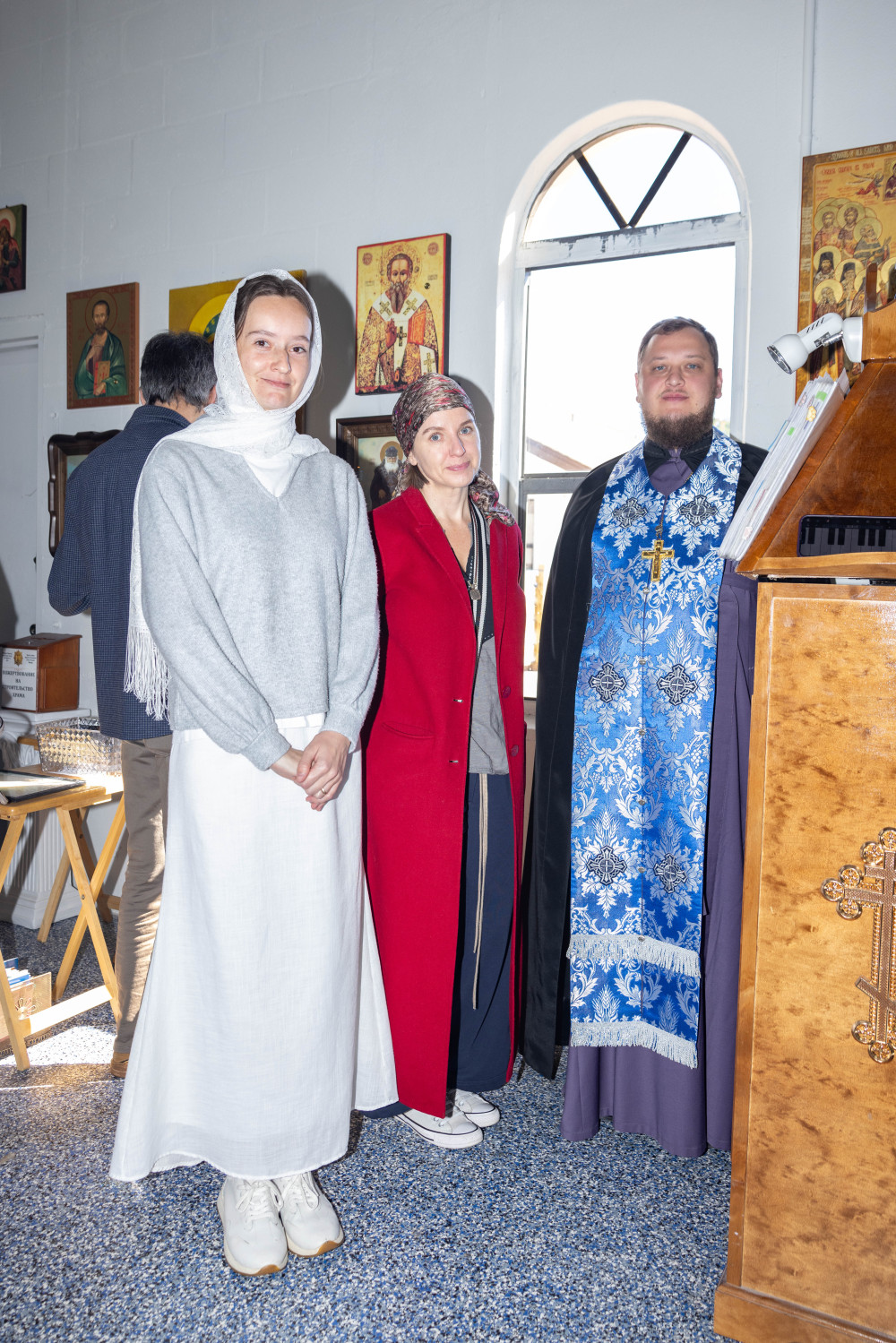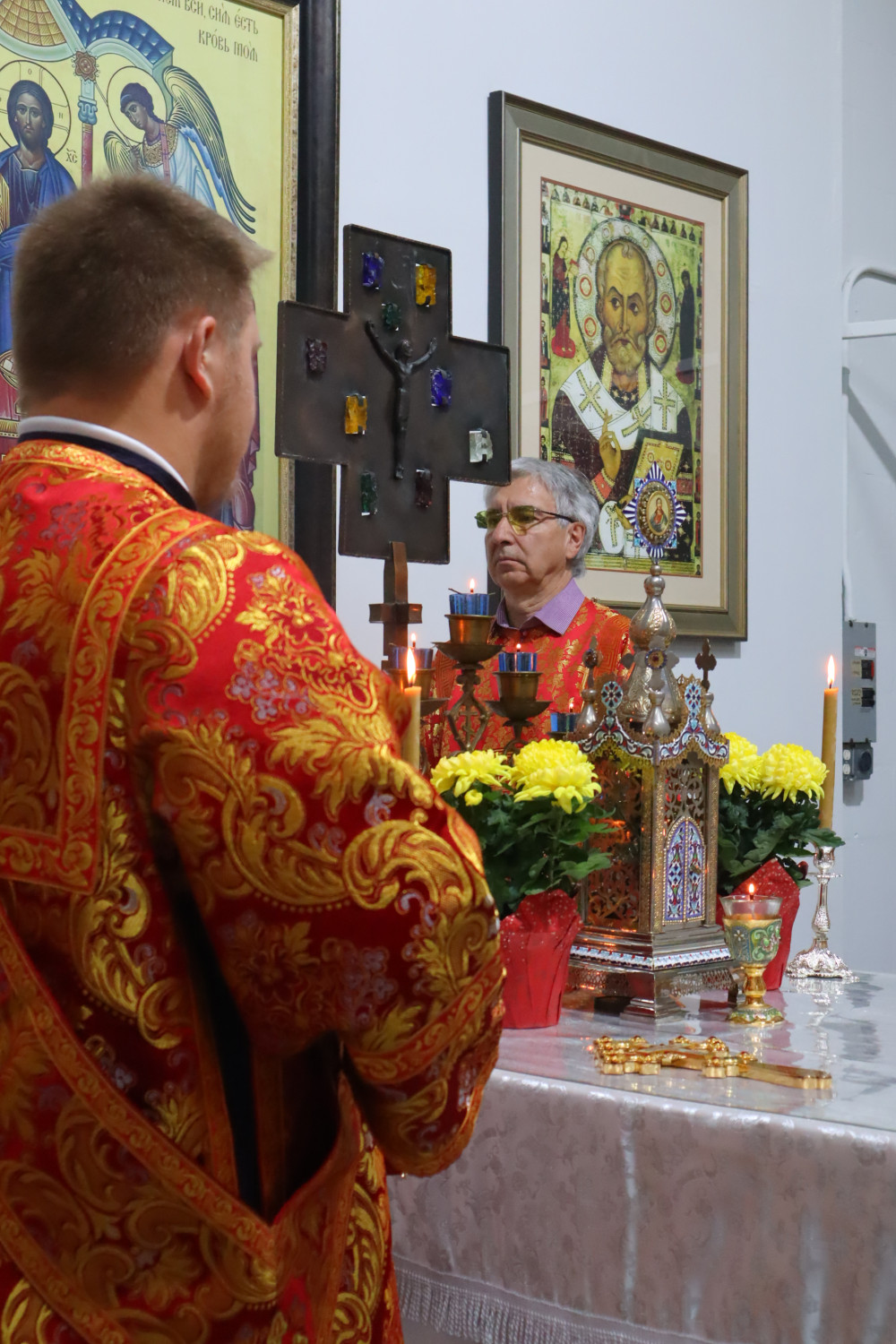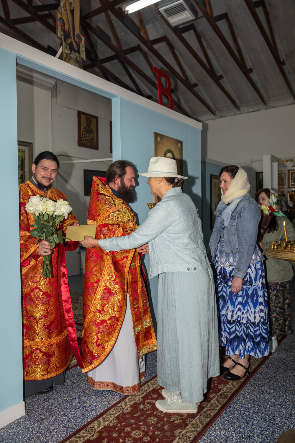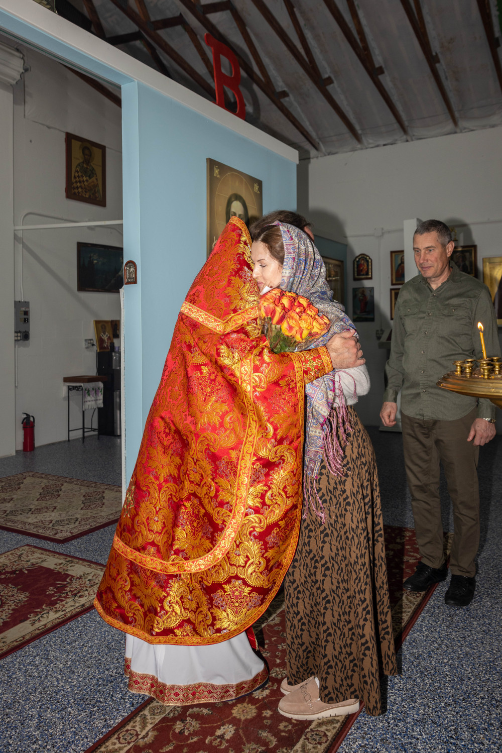 После Литургии отец Дамиан поздравил настоятеля монастыря, архимандрита Стефана, с 45-летием и подарил ему украшенный крест. Также от имени прихожан слово поздравления произнесла Виктория Бурцева, преподнеся цветы.