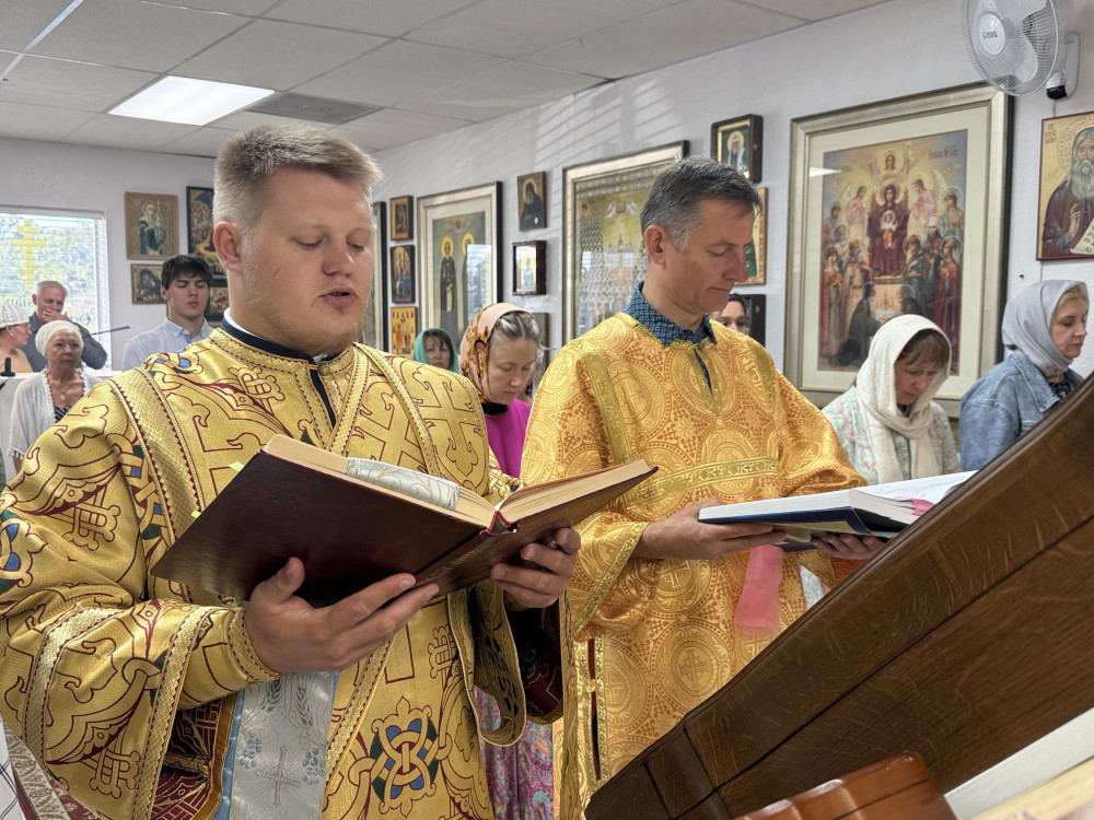 Воскресные службы традиционно начались с акафиста Почаевской иконе Божией Матери. Божественную литургию после акафиста совершили настоятель храма отец Стефан, иеродиакон Паисий и диакон Александр.