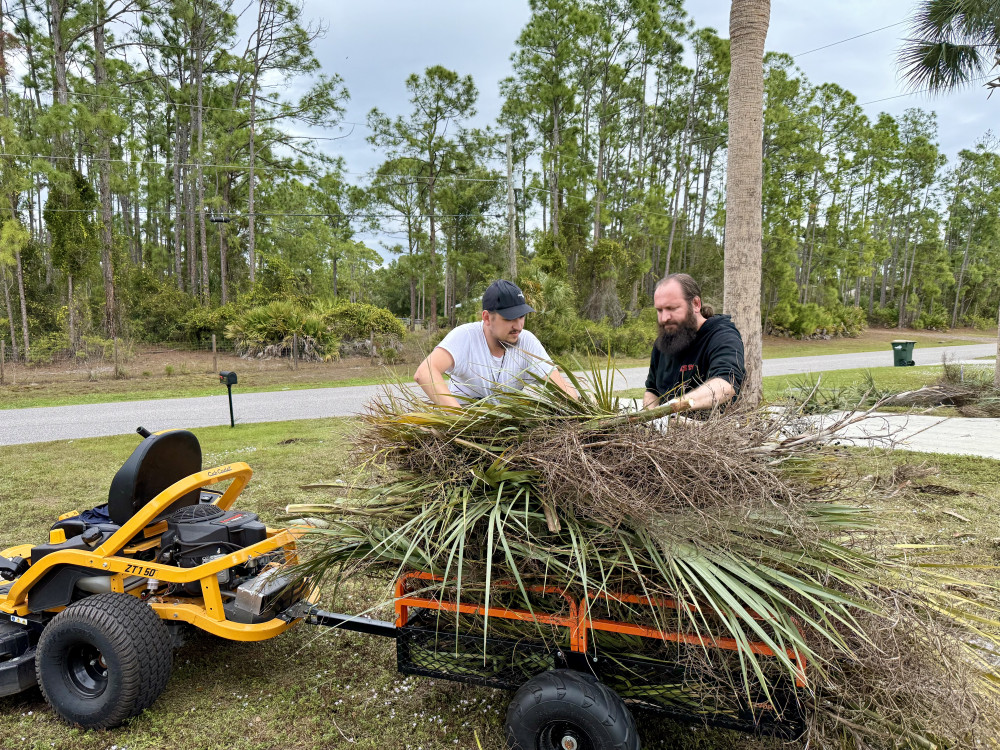 Вчера к монастырю прибыл мрамор, и именно для его выгрузки мы взяли в аренду телескопический погрузчик SkyTrak 6034 (Herc Rentals). А сегодня, до возврата техники, по милости Божией смогли использовать его и для подрезки пальм, и для наведения порядка вокруг деревьев.