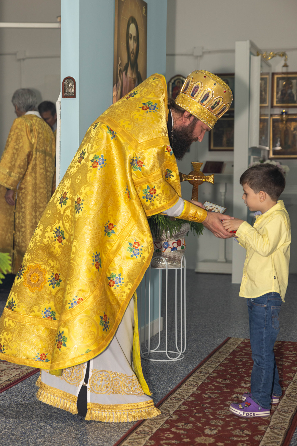 Также отец Стефан поздравил с прошедшим днём рождения маленького прихожанина Дениску и подарил ему иконку, просфору и сладости.