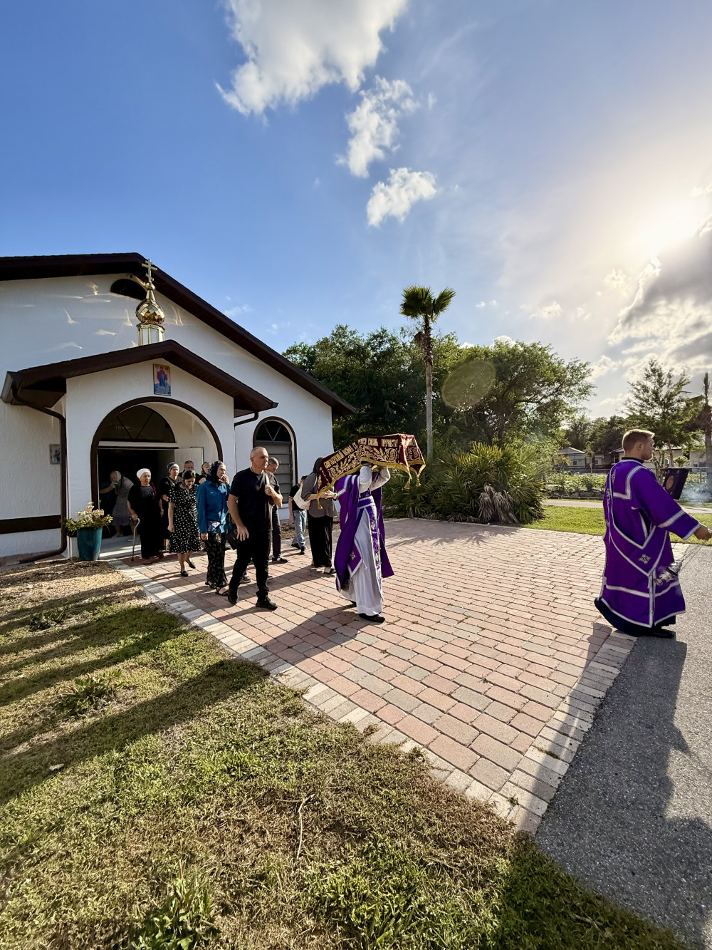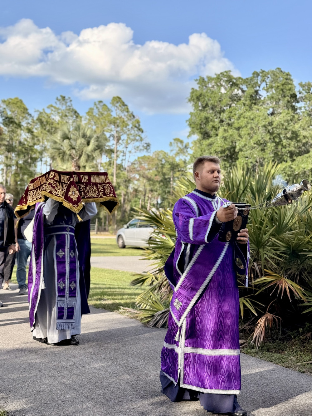 В конце великого славословия священник, братия и прихожане обнесли Плащаницу вокруг храма с пением Трисвятого.